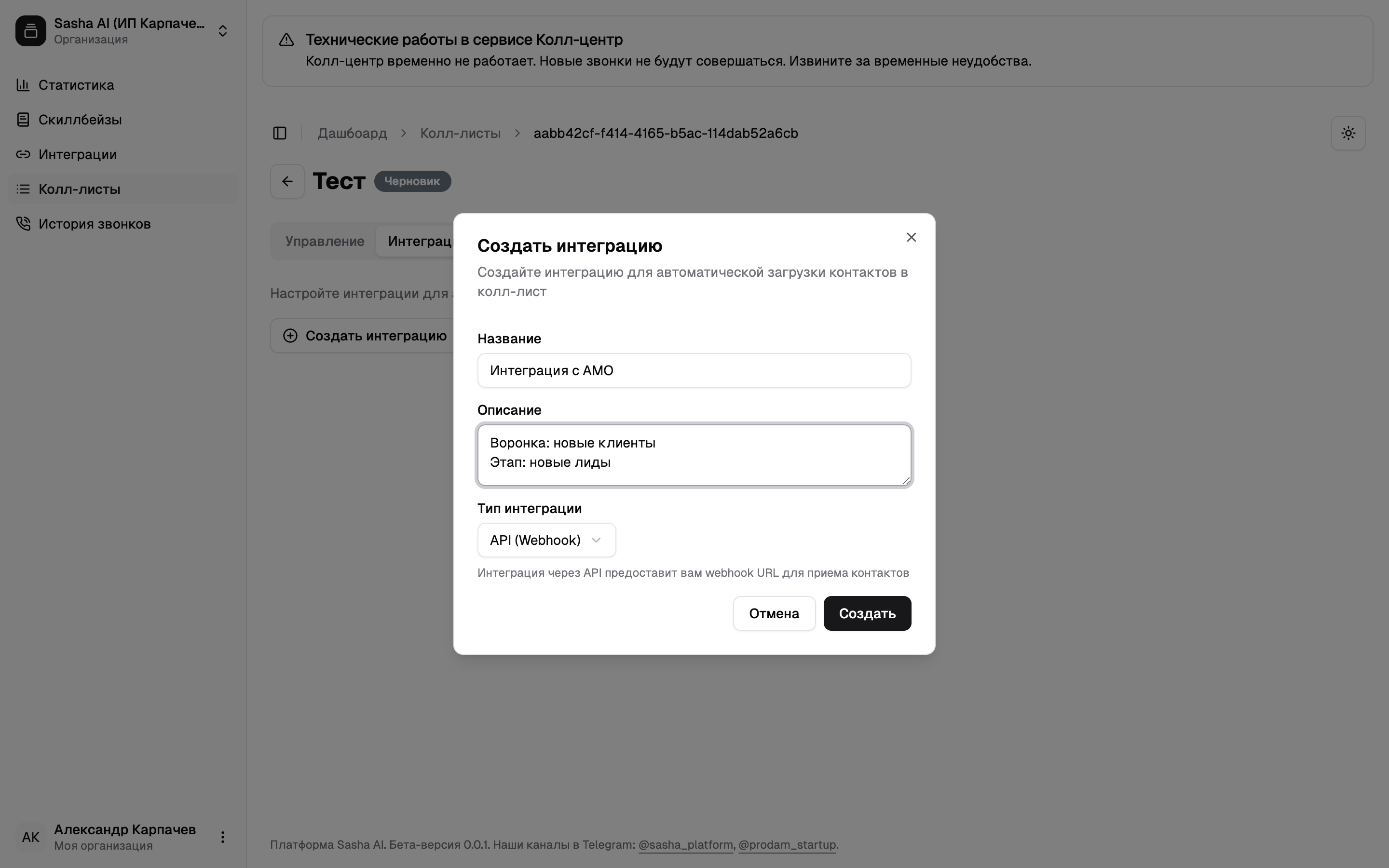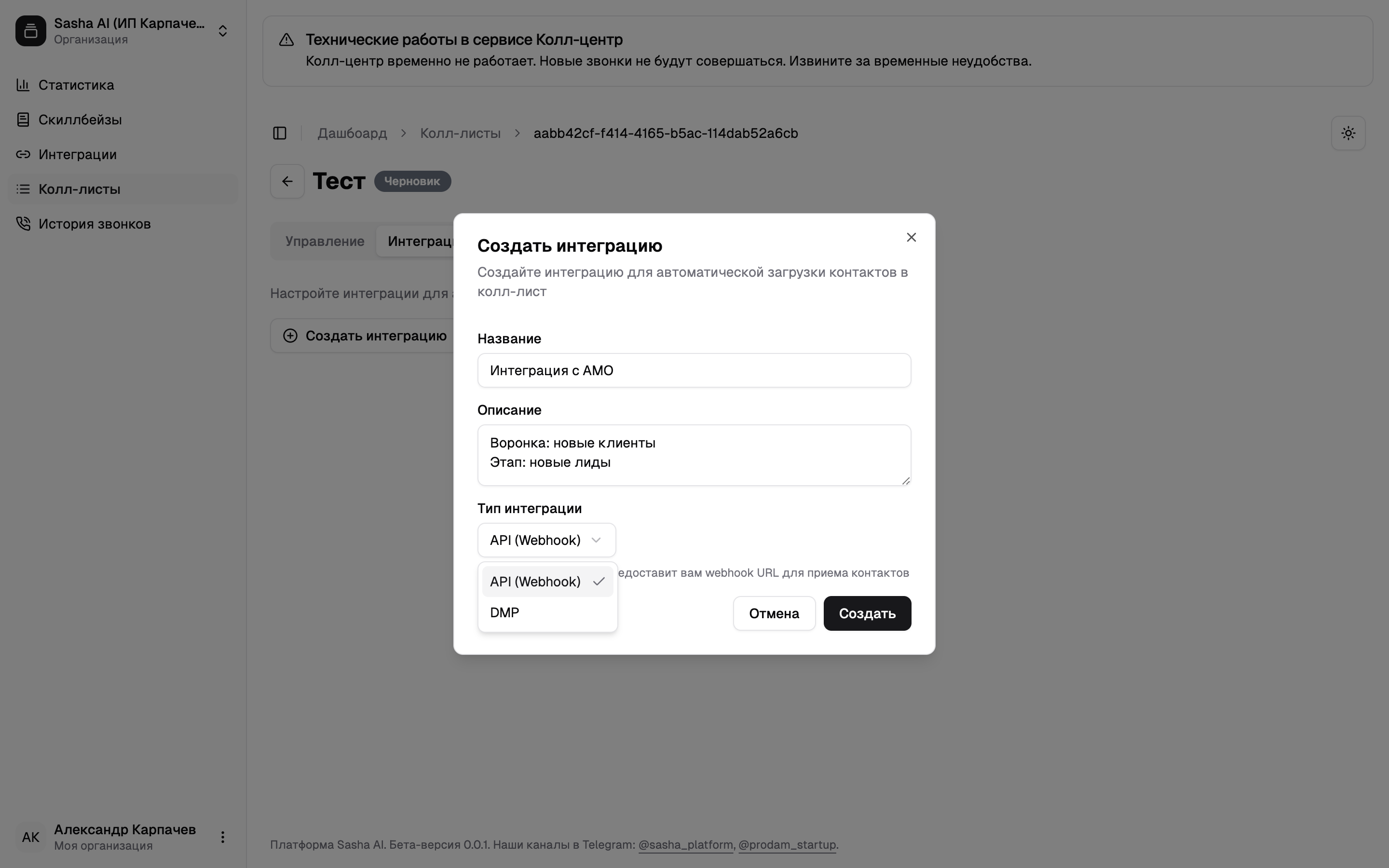 - В выпадающем списке «Тип интеграции» установите значение «API (Webhook)»