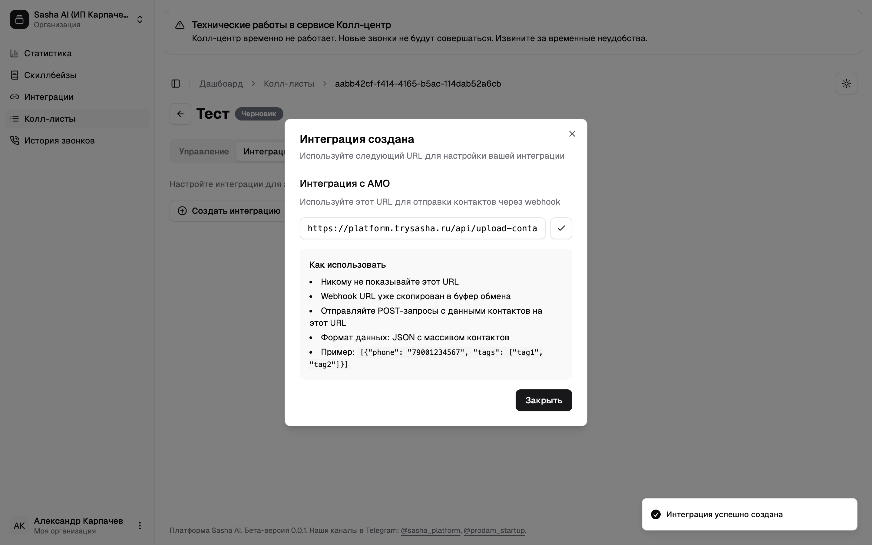 Перед вами откроется всплывающее окно с URL адресом созданного вебхука.