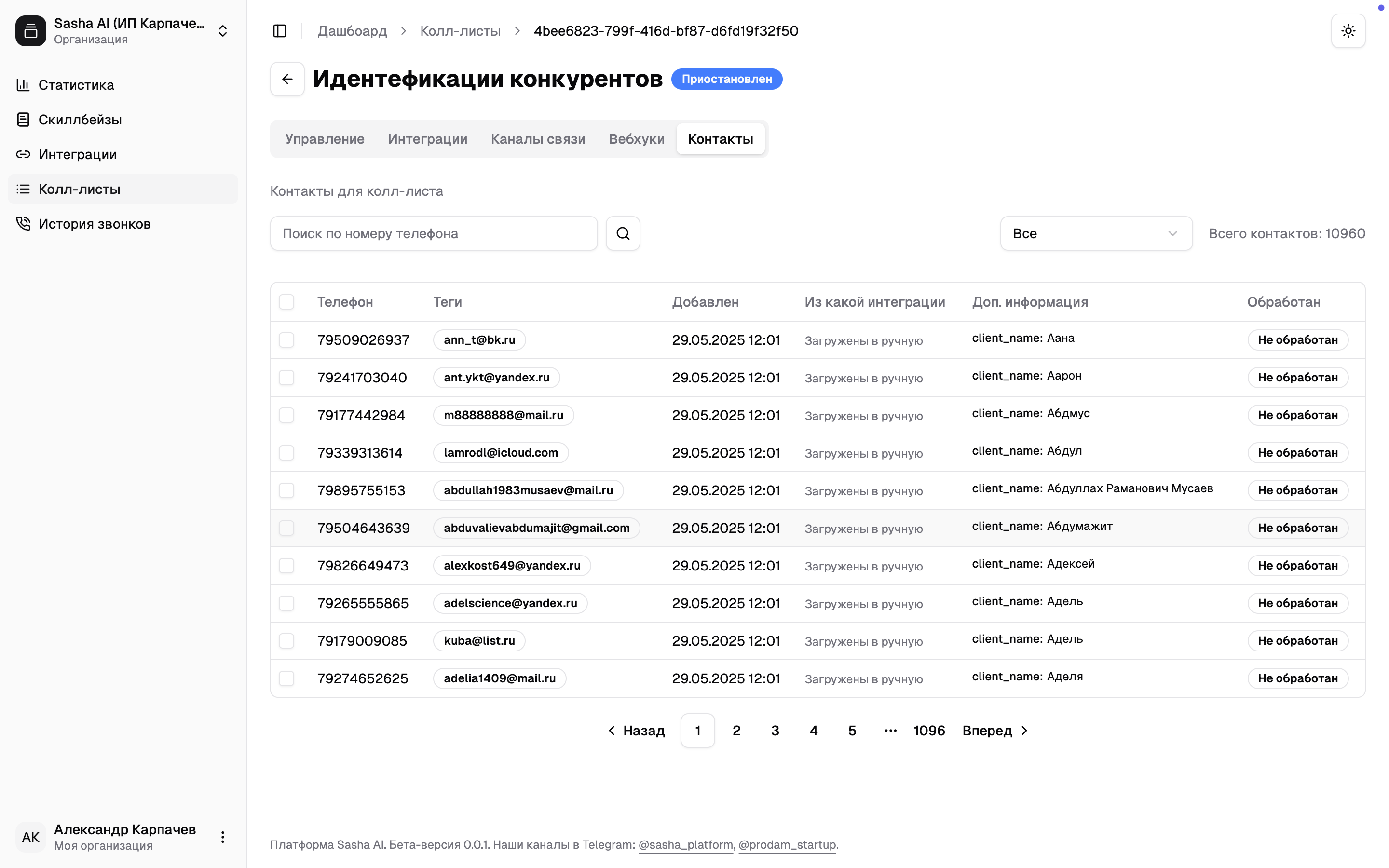 Перед вами откроется таблица с загруженными в этот колл-лист контактами.