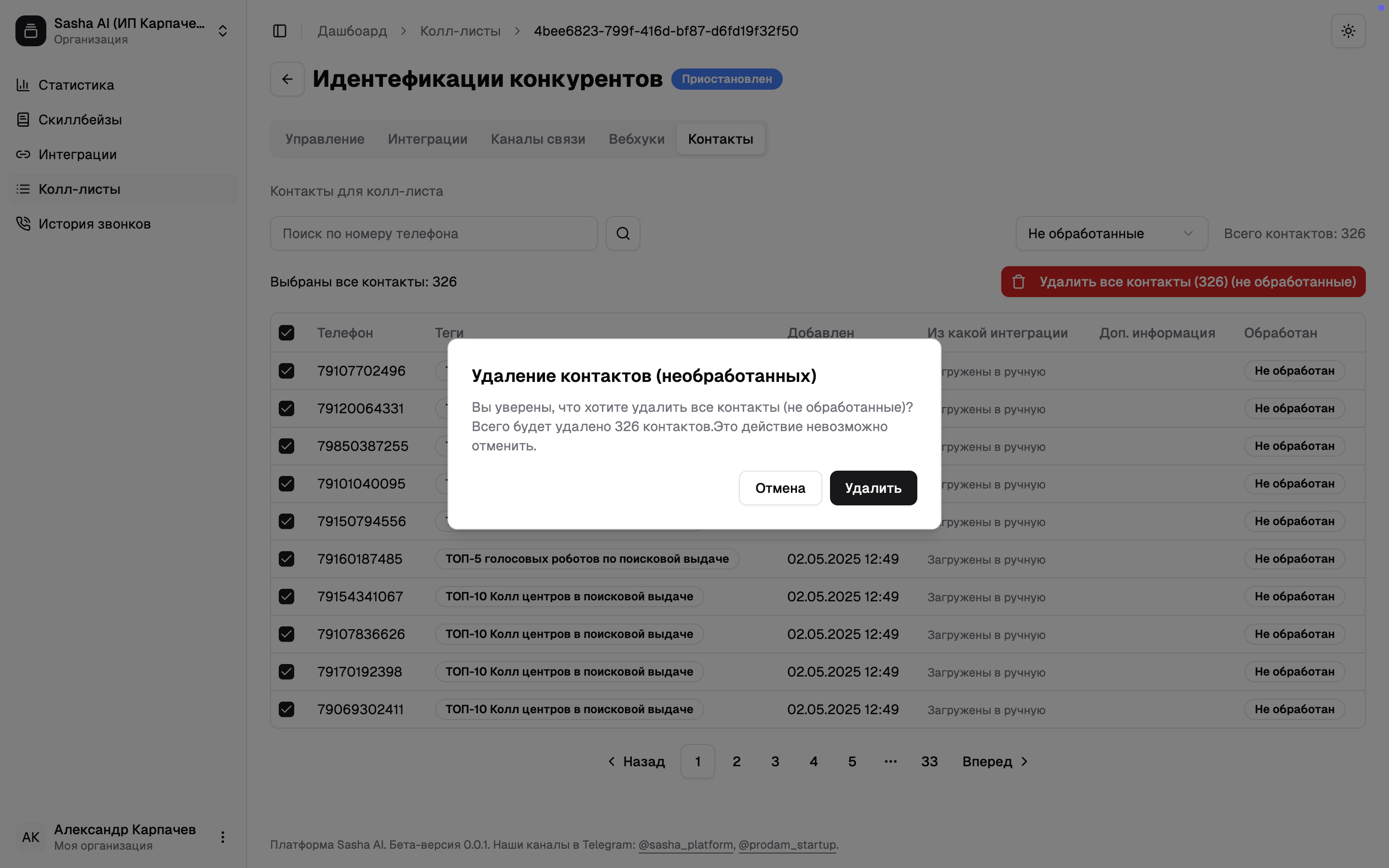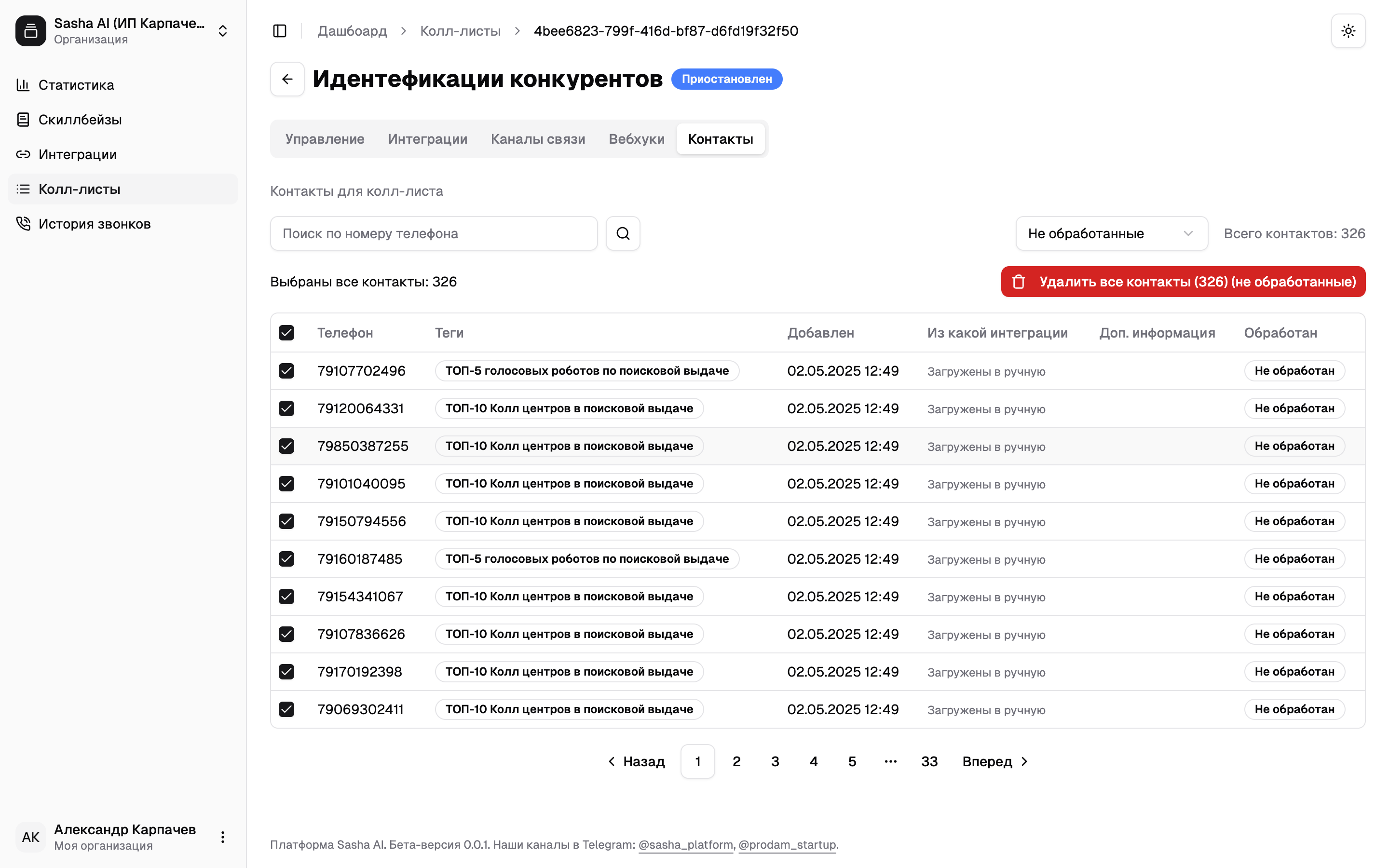 Сверху есть фильтр по статусу обработки. Используйте его, чтобы выбрать только обработанные и необработанные контакты и удалить их. Для удаления контактов:- Отфильтруйте таблицу или выберите нужные номера