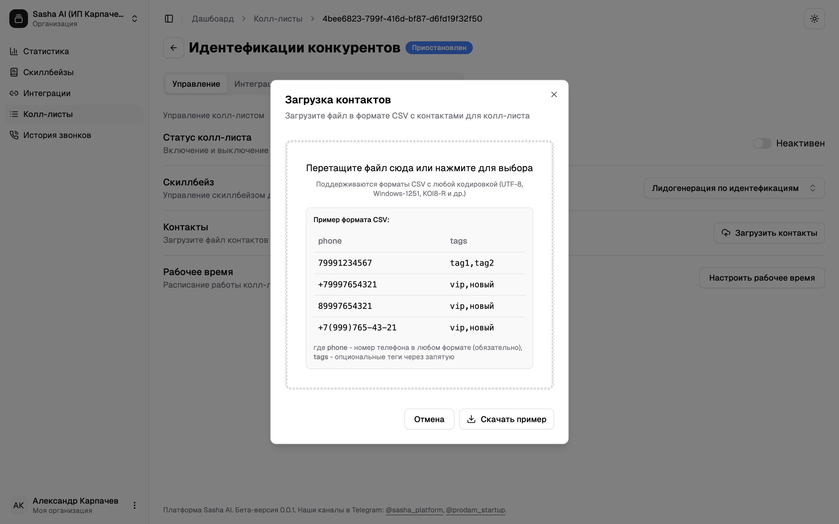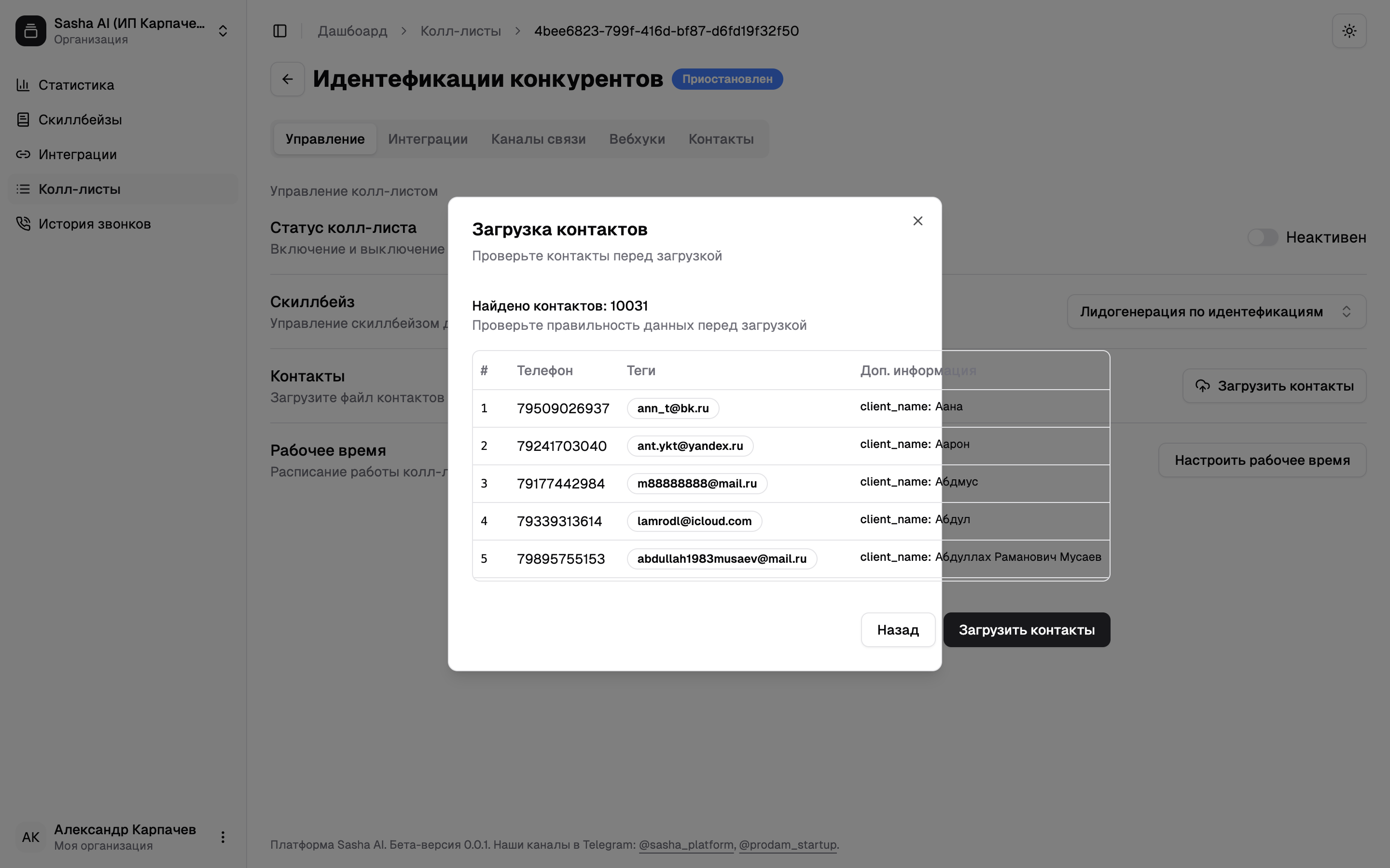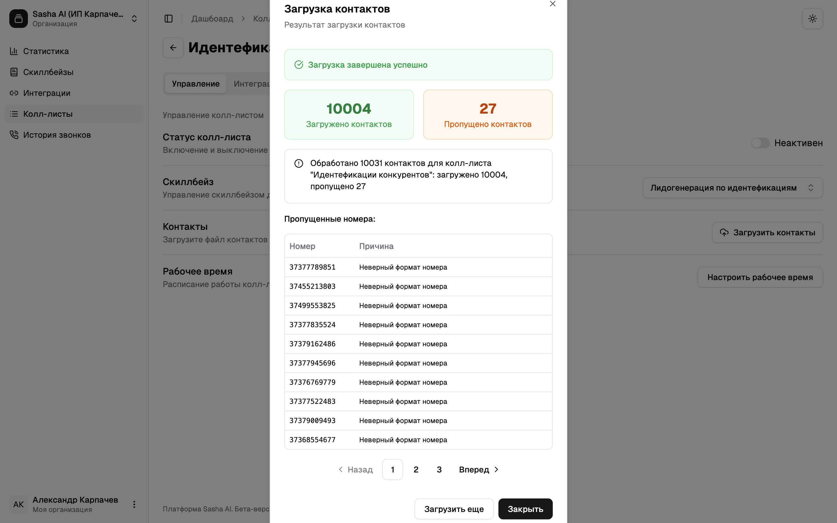 Перед вами появится отчет о загрузке контактов. Здесь вы можете отследить:- Добавленные в колл-лист контакты