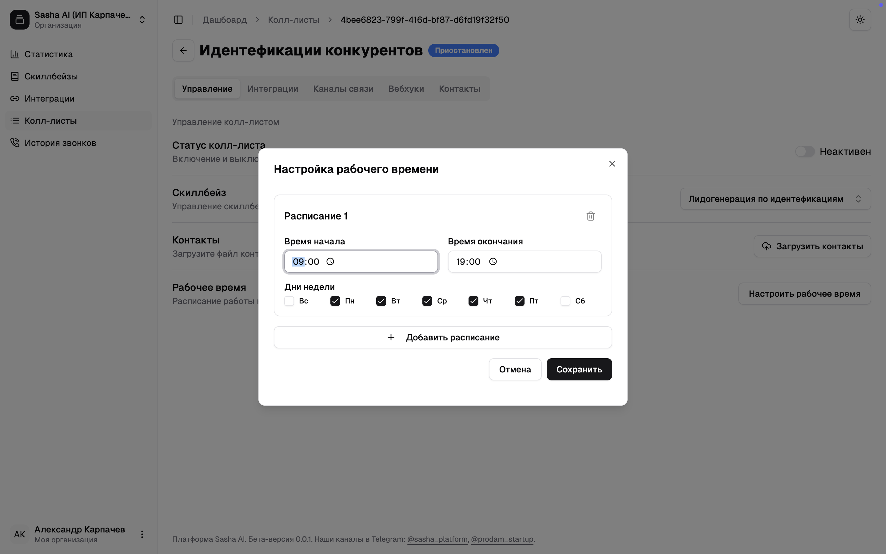 В открывшемся поле выберите дни недели и время, в которое вы хотите звонить своим клиентам.