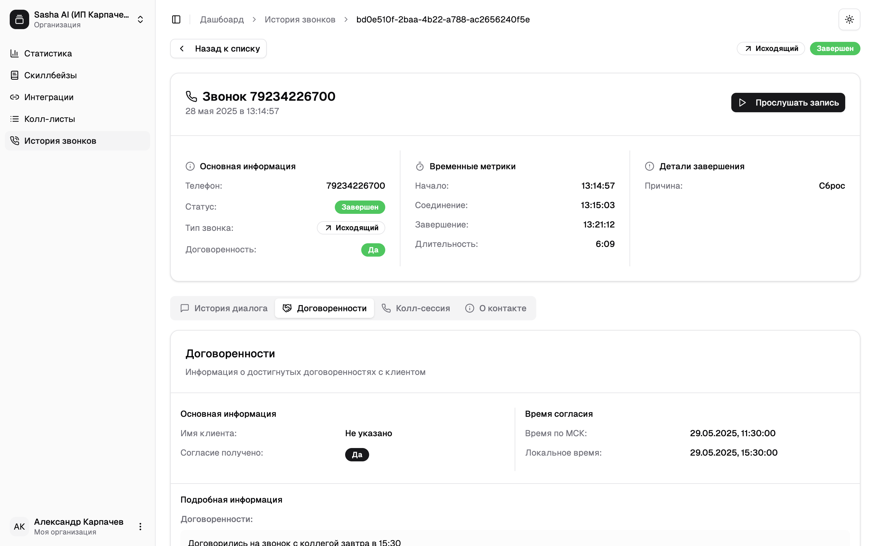 Представьте, что у Саши есть свой РОП. По итогам каждого телефонного разговора он анализирует каждую историю диалога и отвечает на вопрос:Была ли достигнута какая-либо договоренность или хотя бы интенция от клиента на следующий шаг?
