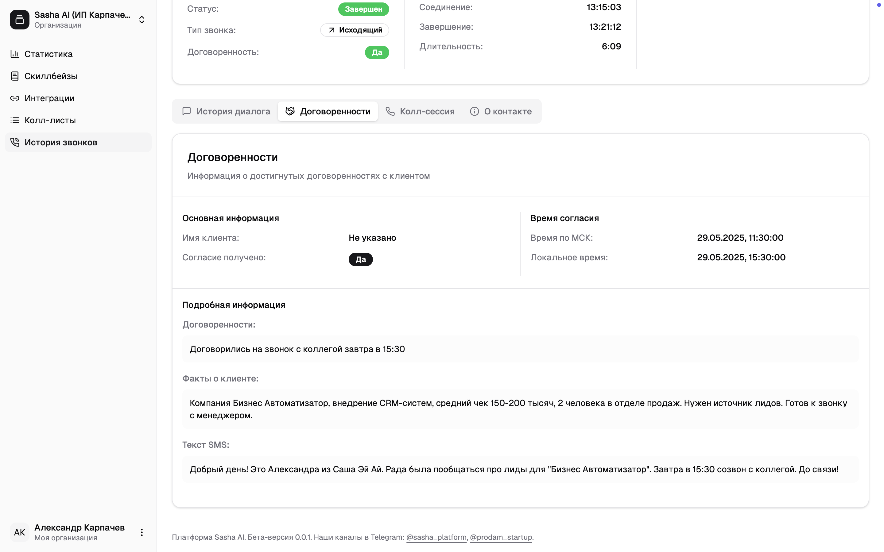 Отсюда вы можете понять, что для корректной передачи лидов вам нужно прописывать в плане диалога договоренности, которые Саша должна попытаться сформировать.Что передается с лидом