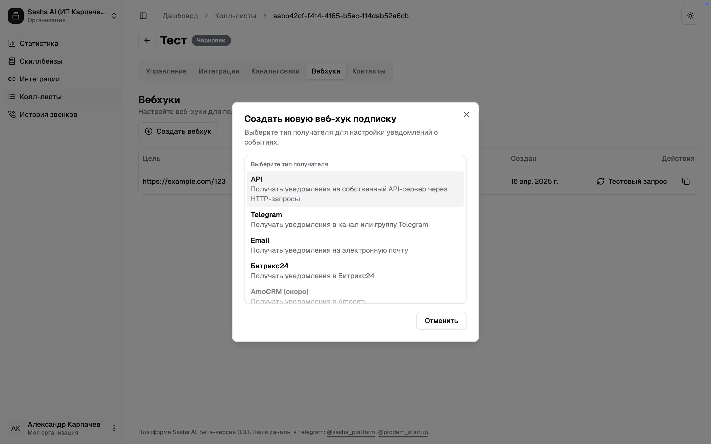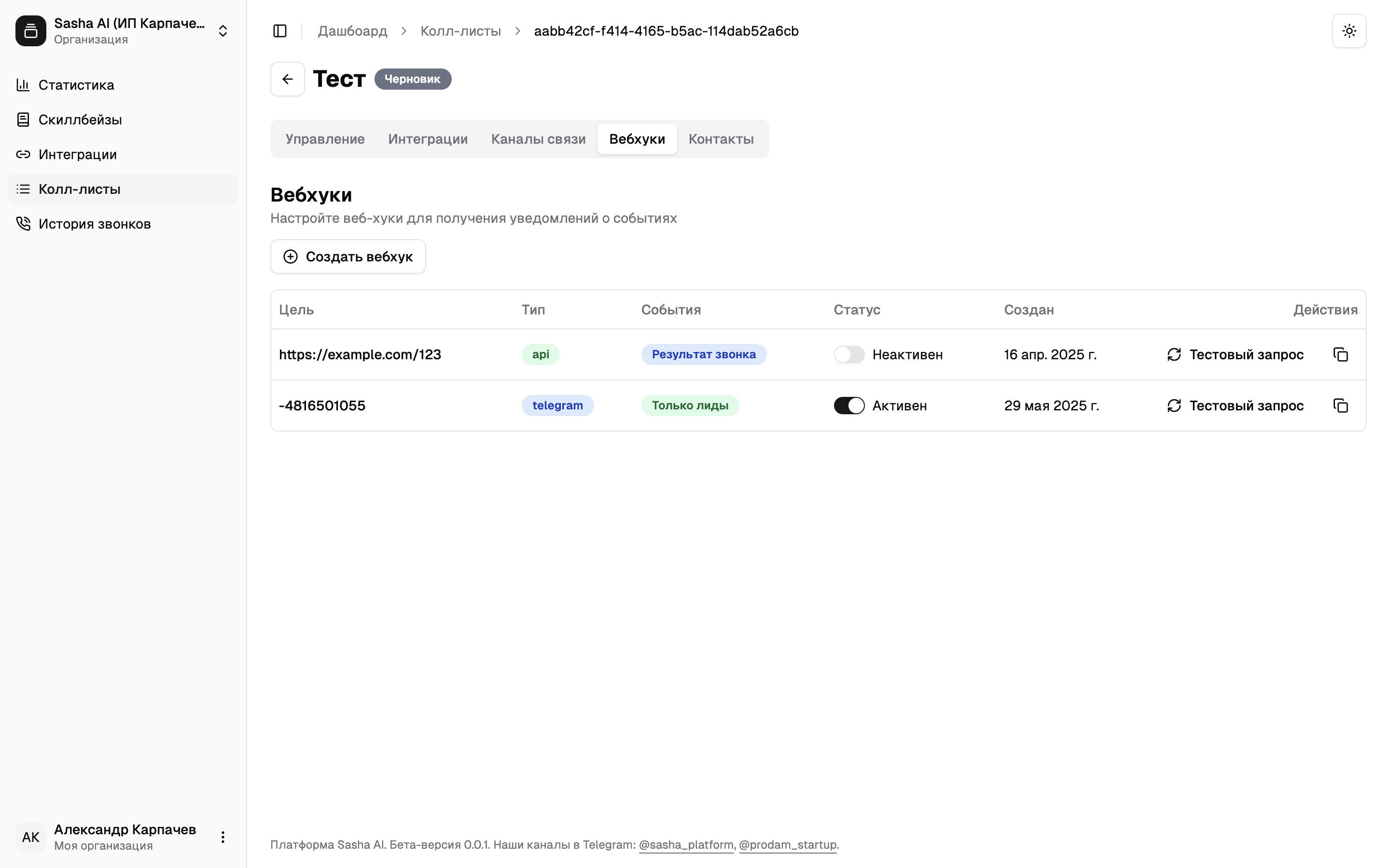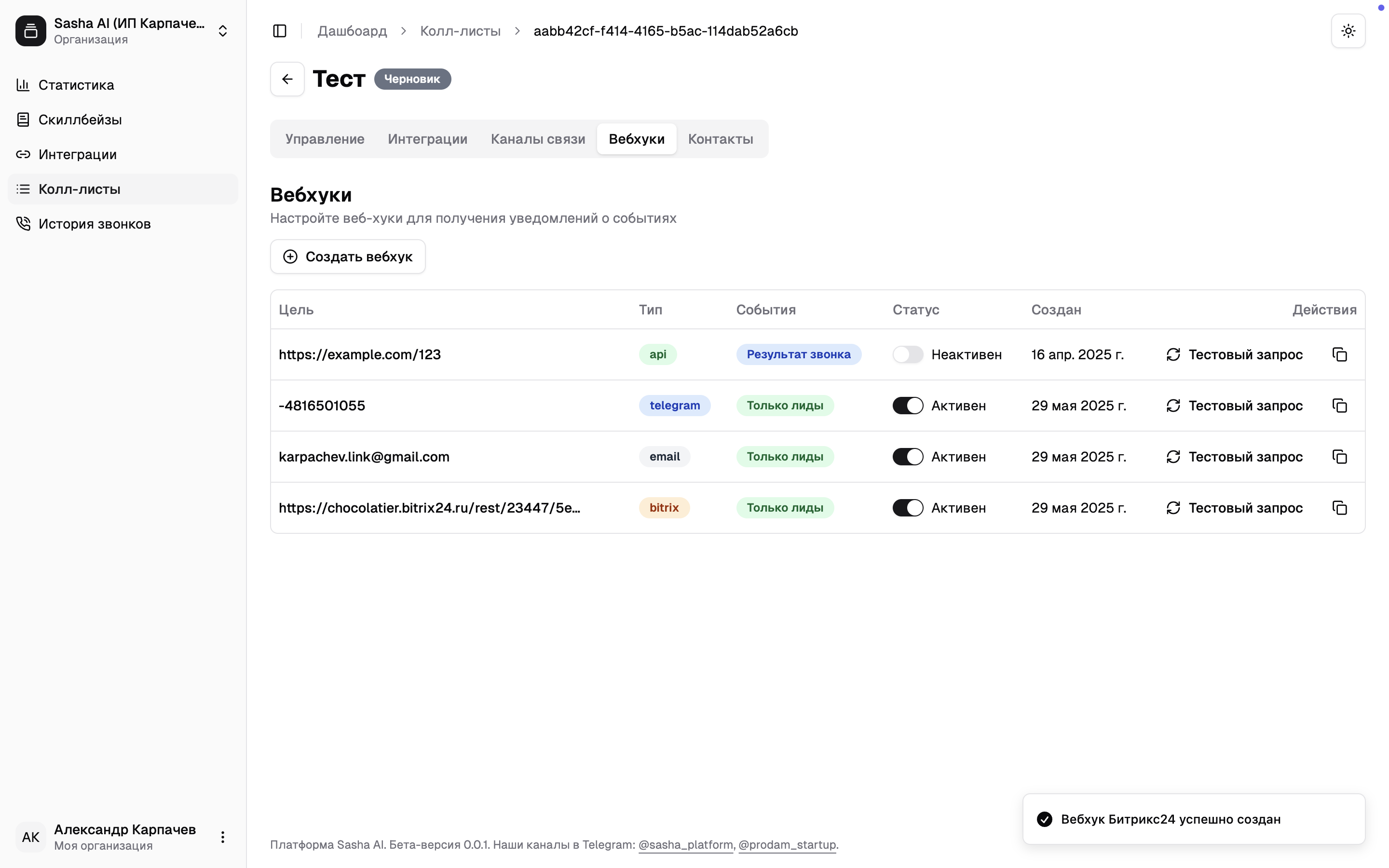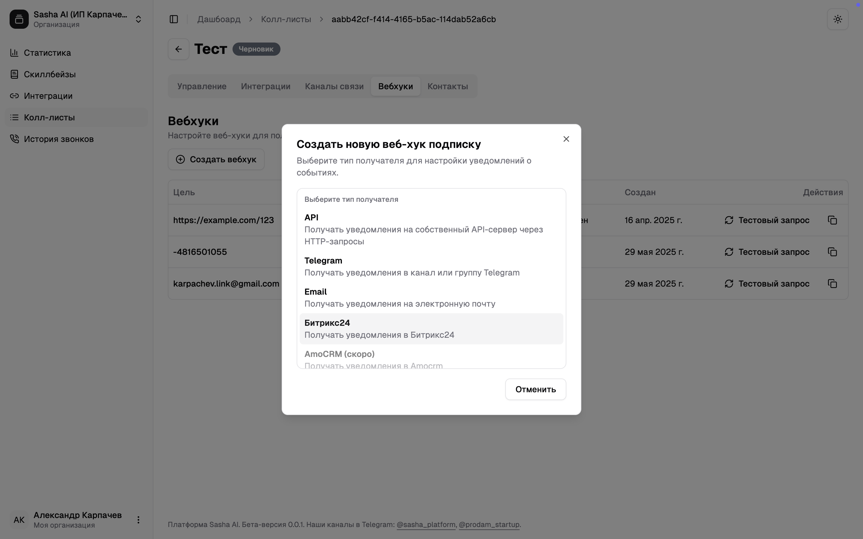 Для настройки вебхуков:- Перейдите в раздел «Колл-листы»