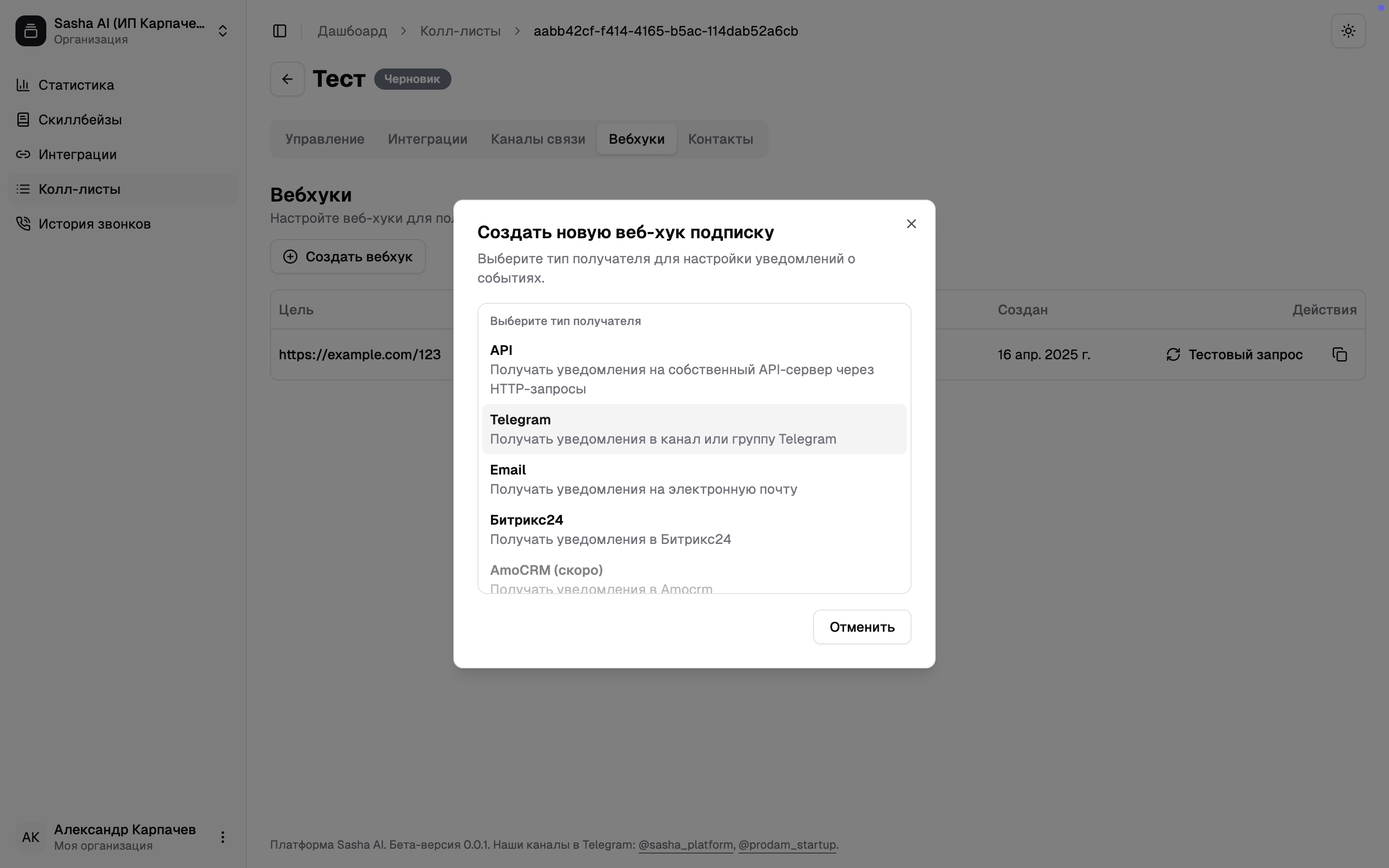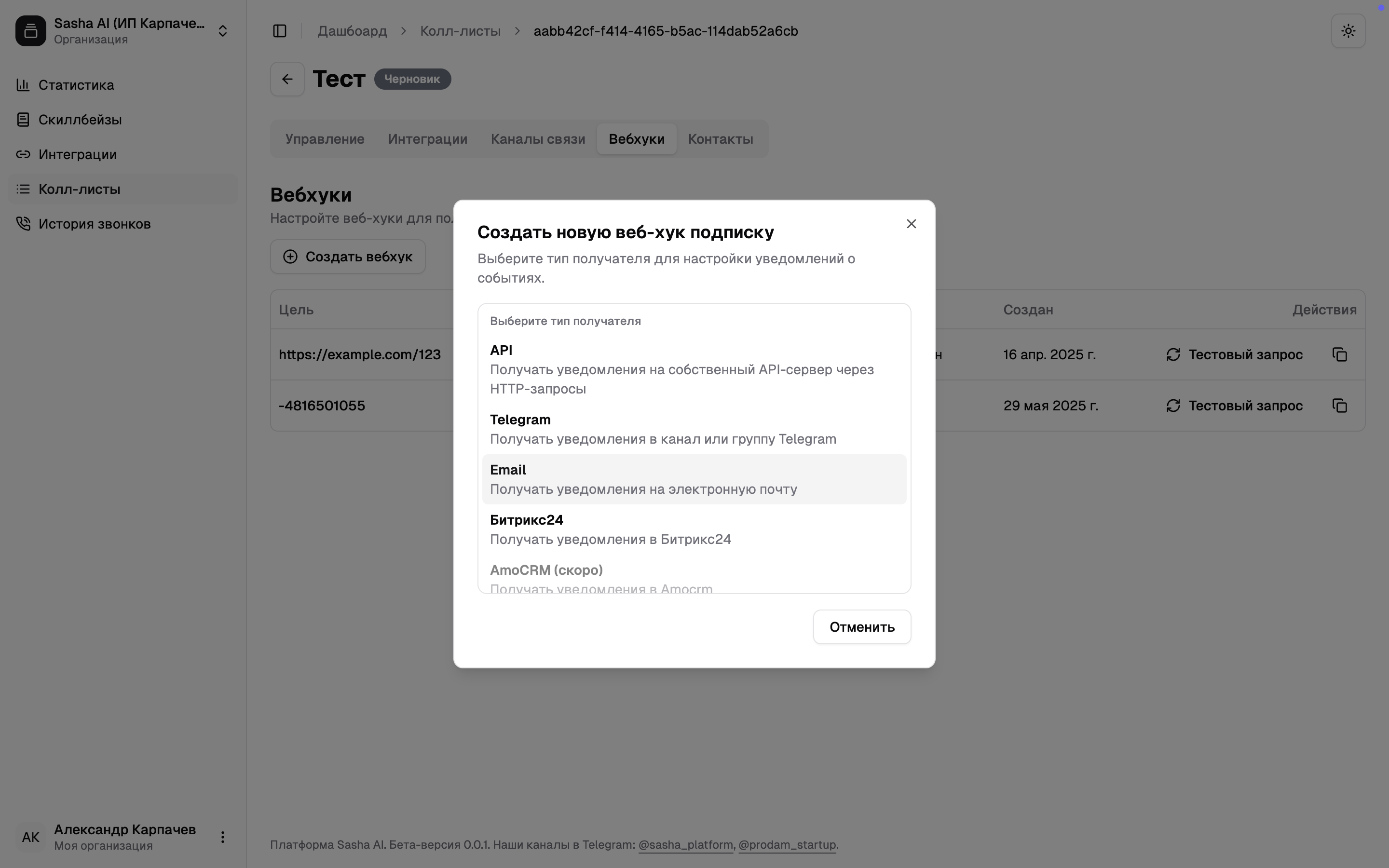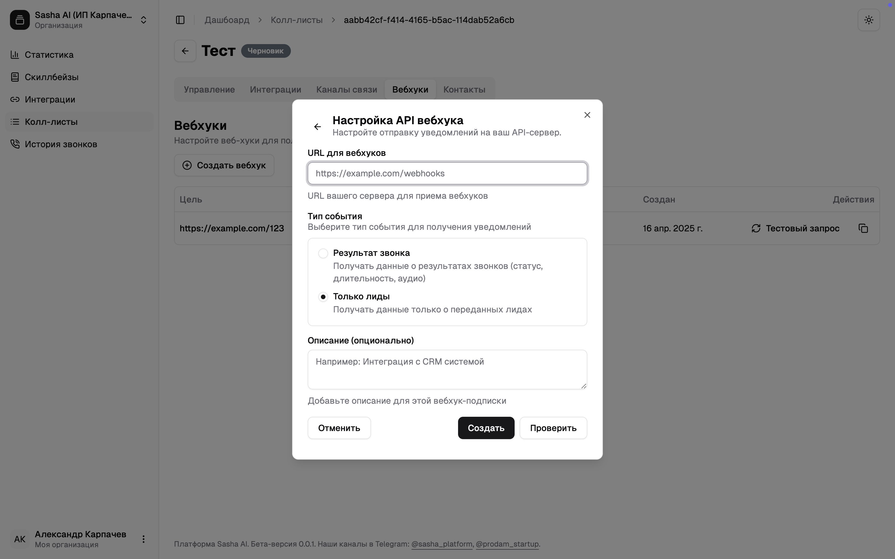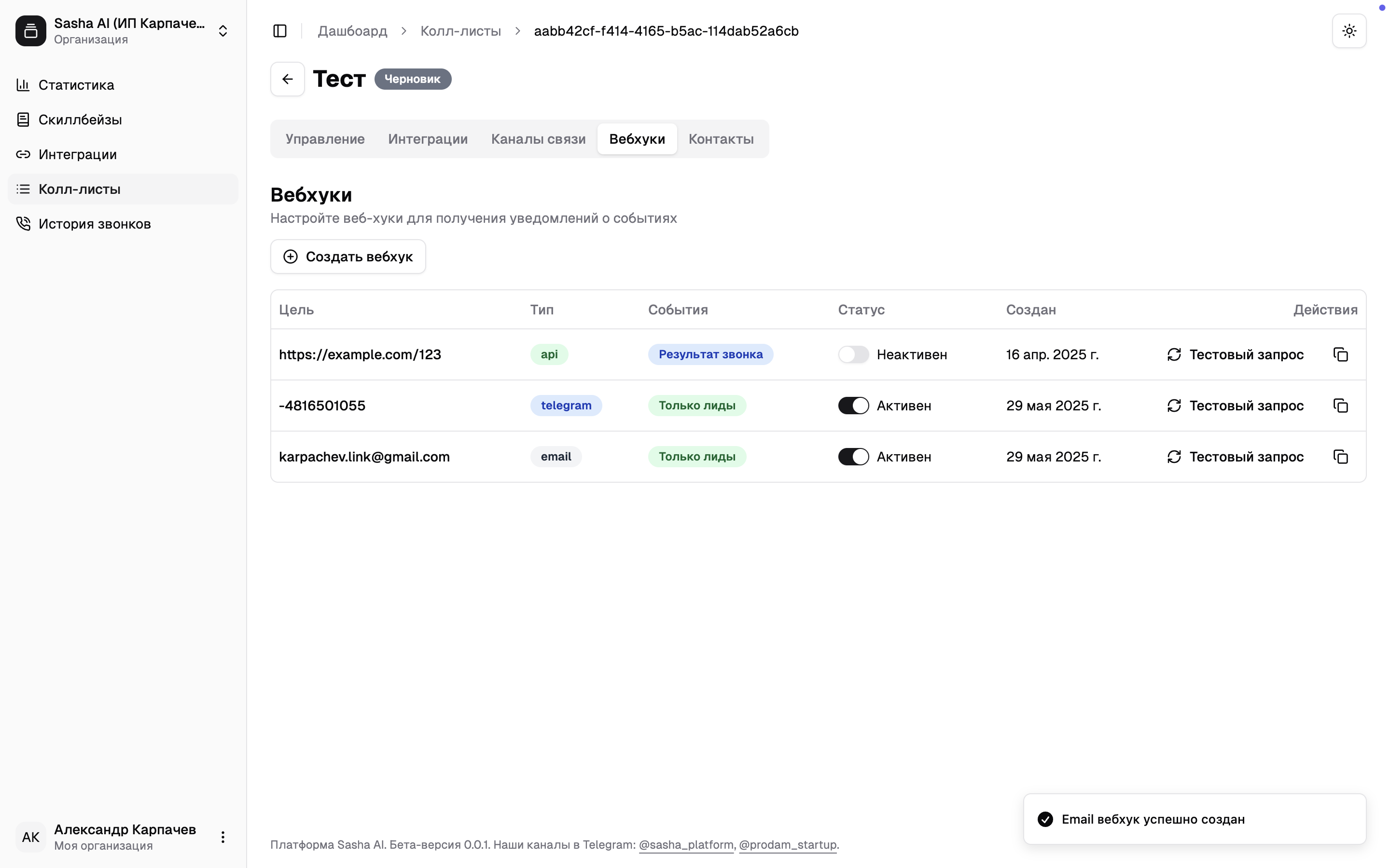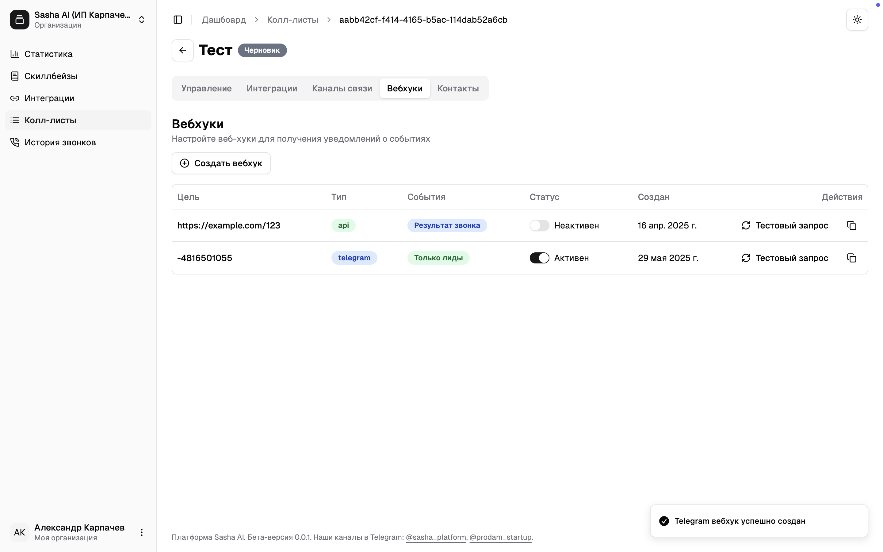 Для настройки вебхуков:- Перейдите в раздел «Колл-листы»
