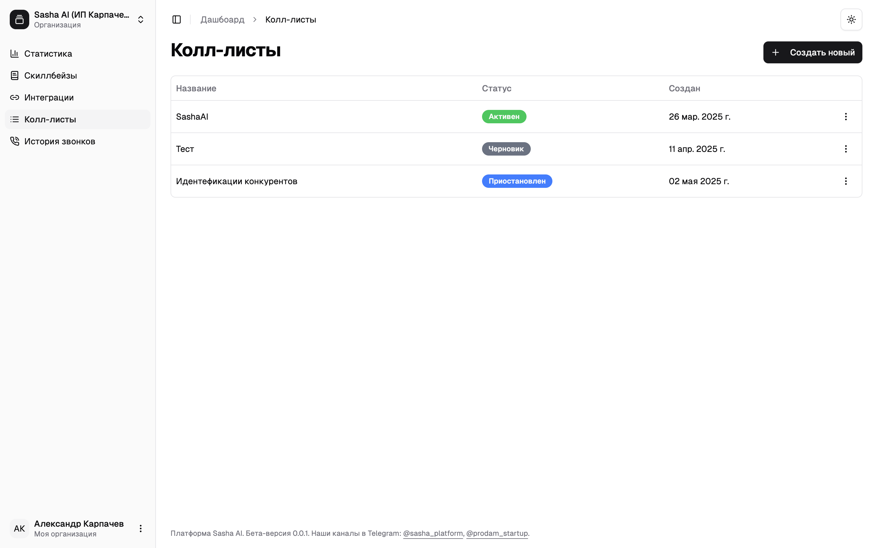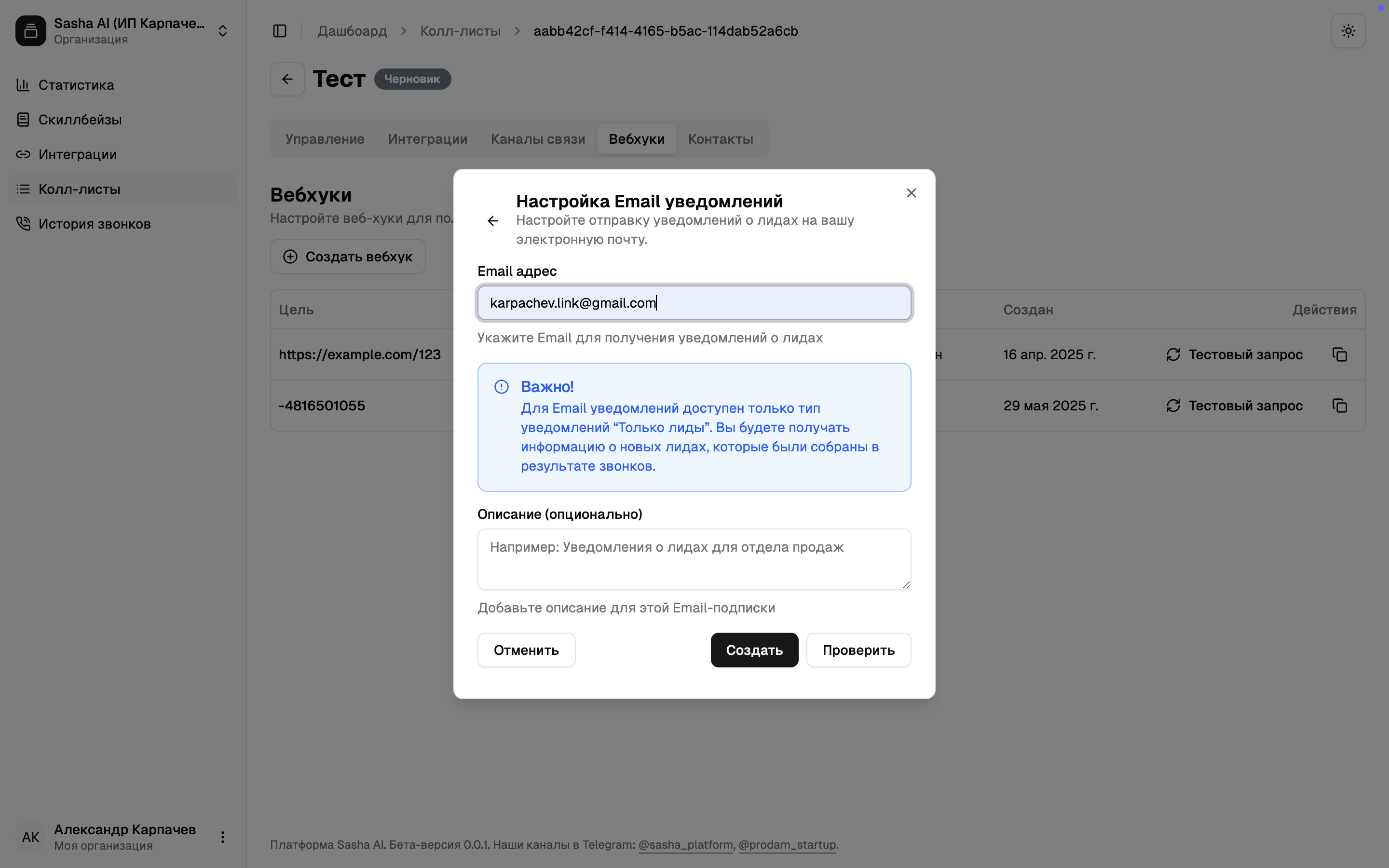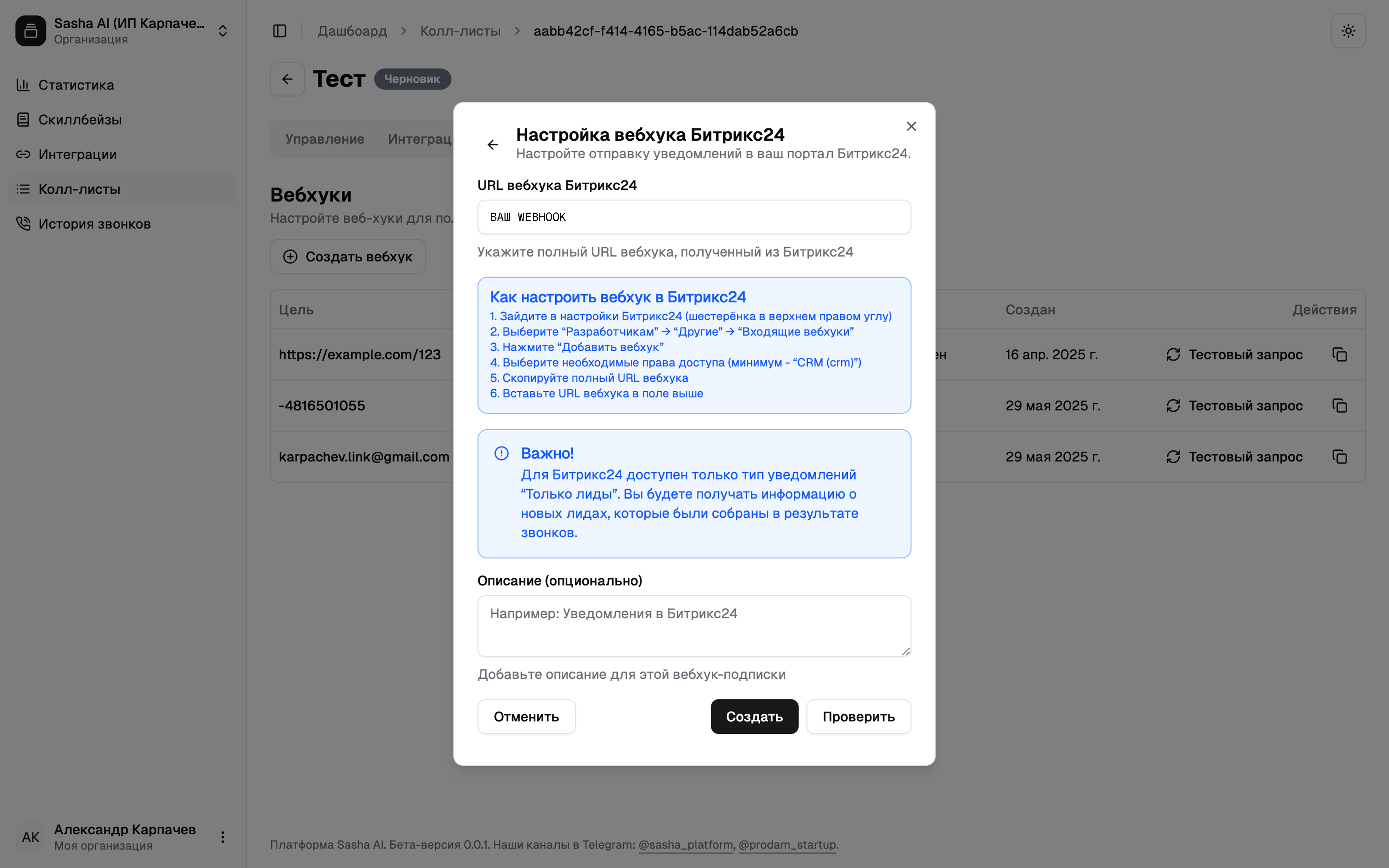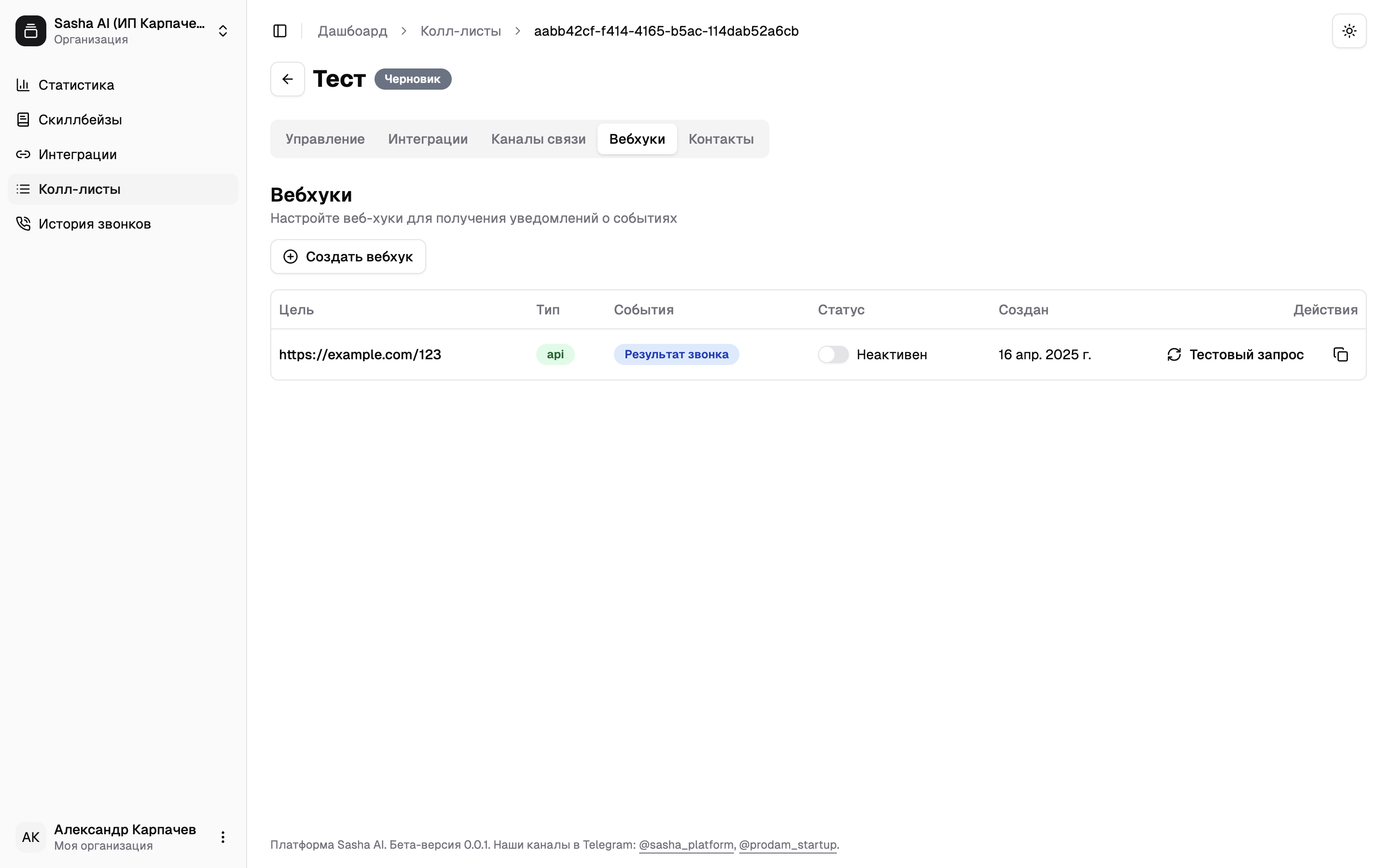 Для настройки вебхуков:- Перейдите в раздел «Колл-листы»