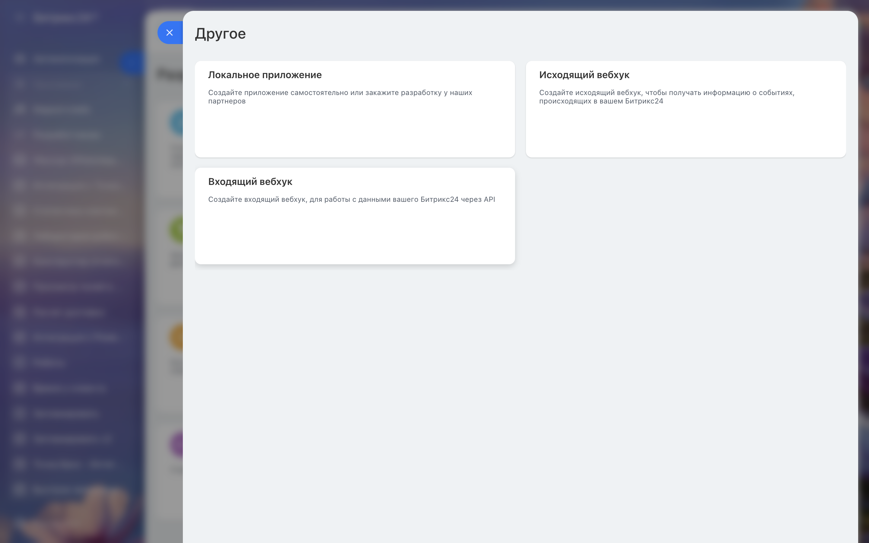 - Нажмите на кнопку «Создать вебхук». В всплывшем окне выберите пункт «Битрикс 24»