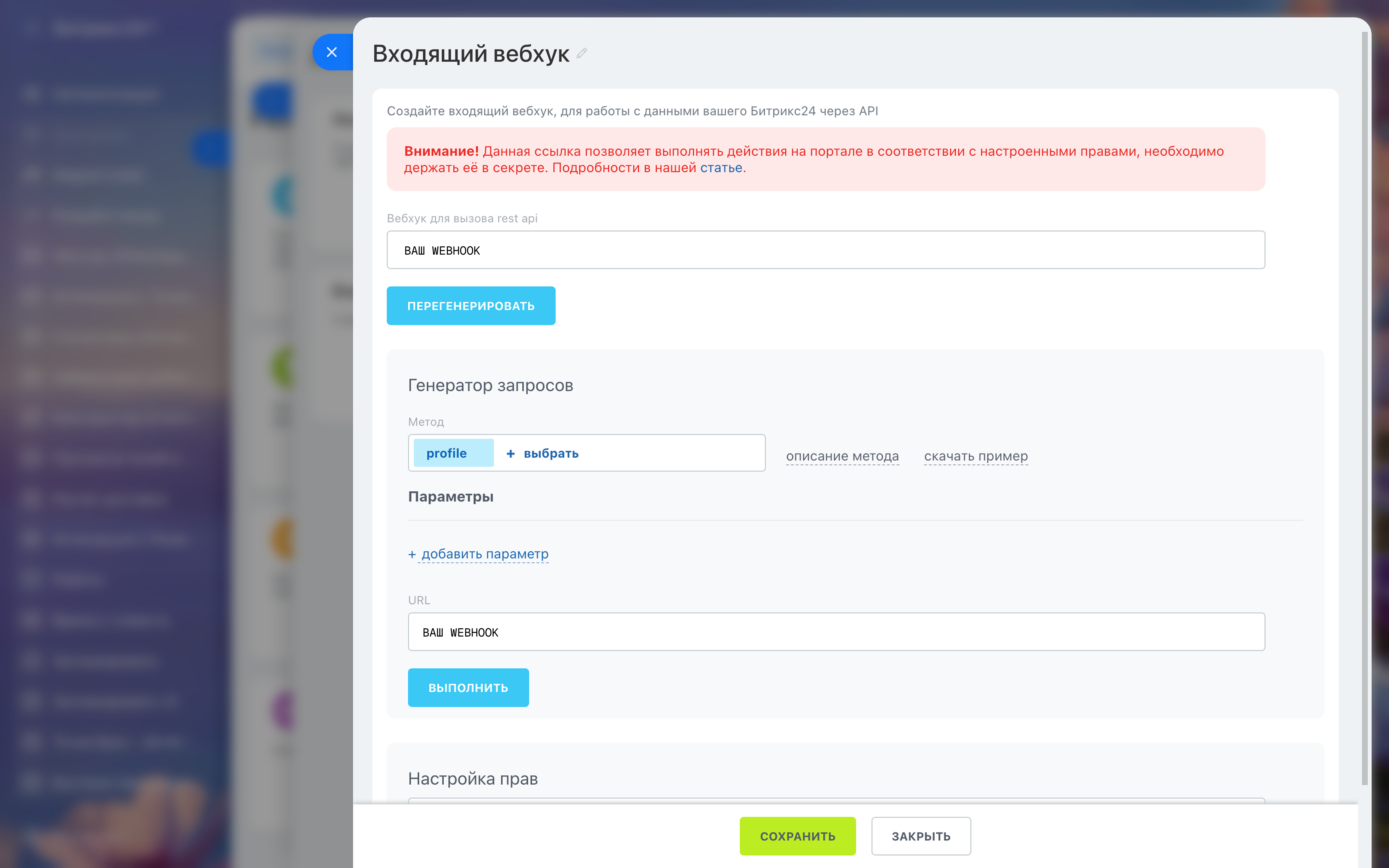- Скопируйте полный URL адрес созданного вебхука и вставьте его в соответствующее поле в всплывающем окне на платформе