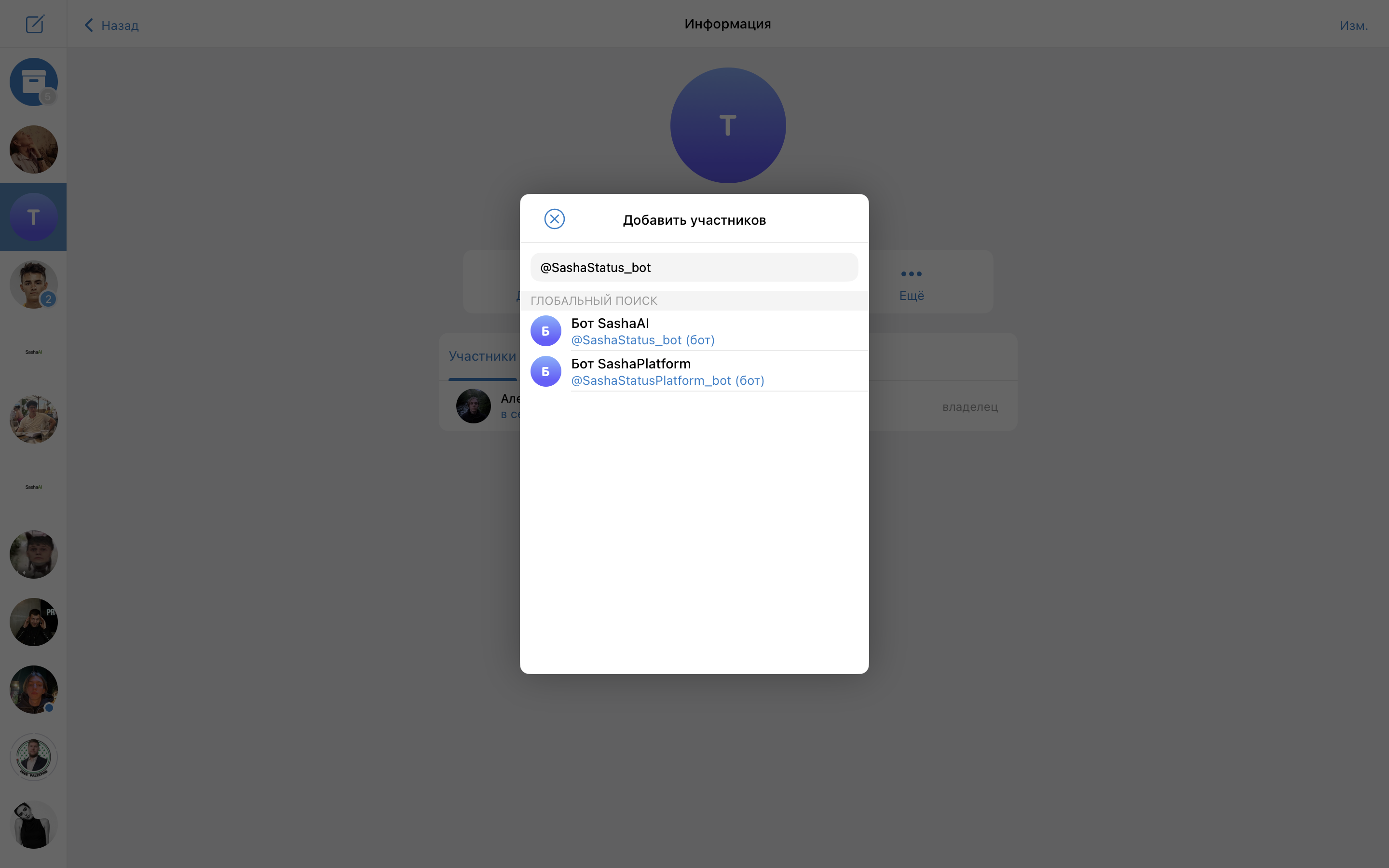 - Добавьте бота @SashaStatus_bot (Бот SashaAI) в новую или ранее созданную группу или канал в телеграмме