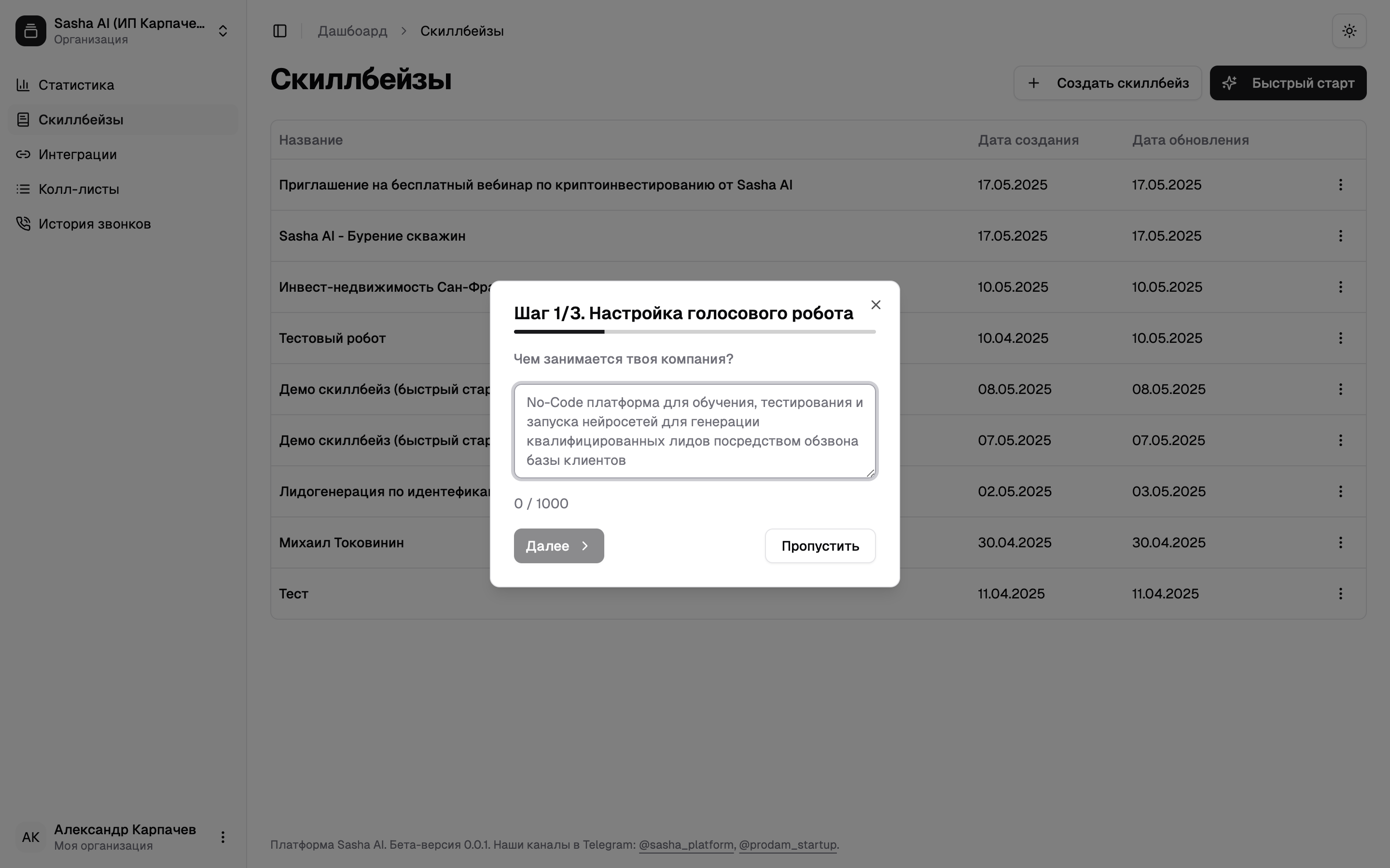 В всплывающем окне расскажите чем занимается ваша компания, кому и с какой целью вы собираетесь звонить.