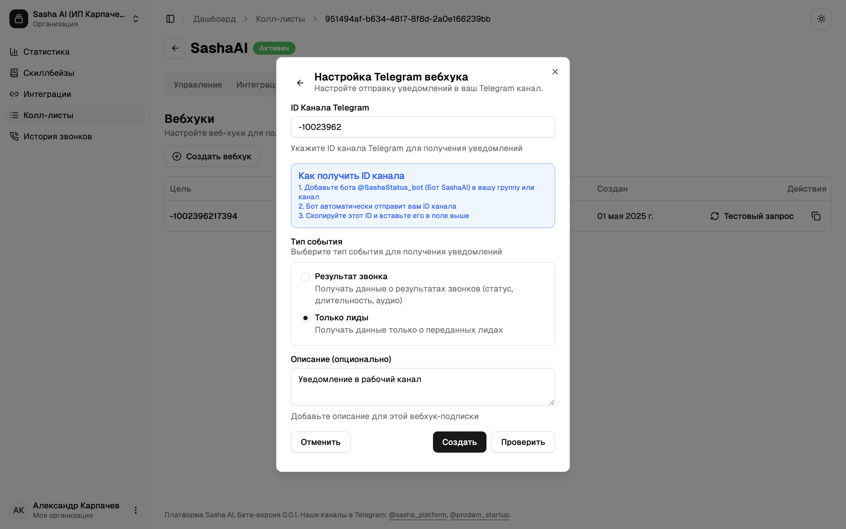 Проследуйте инструкции, вставьте ID чата в всплывающем окне, выберите событие «Только лиды», проверьте интеграцию и