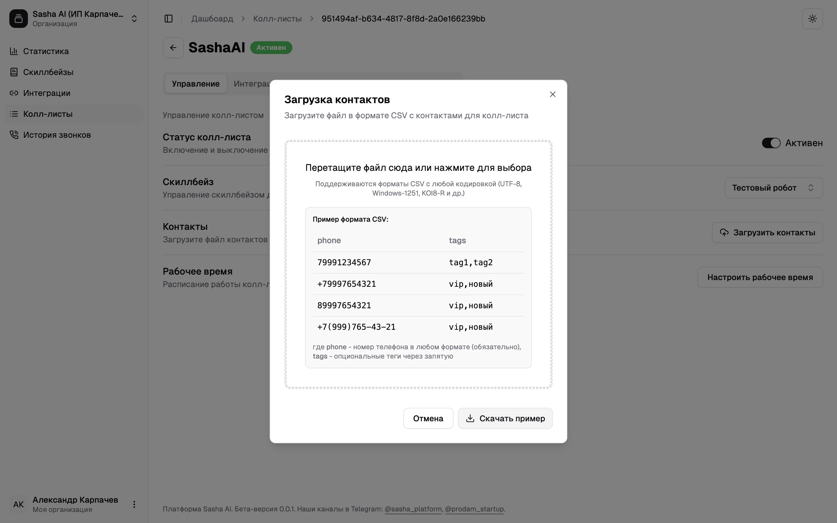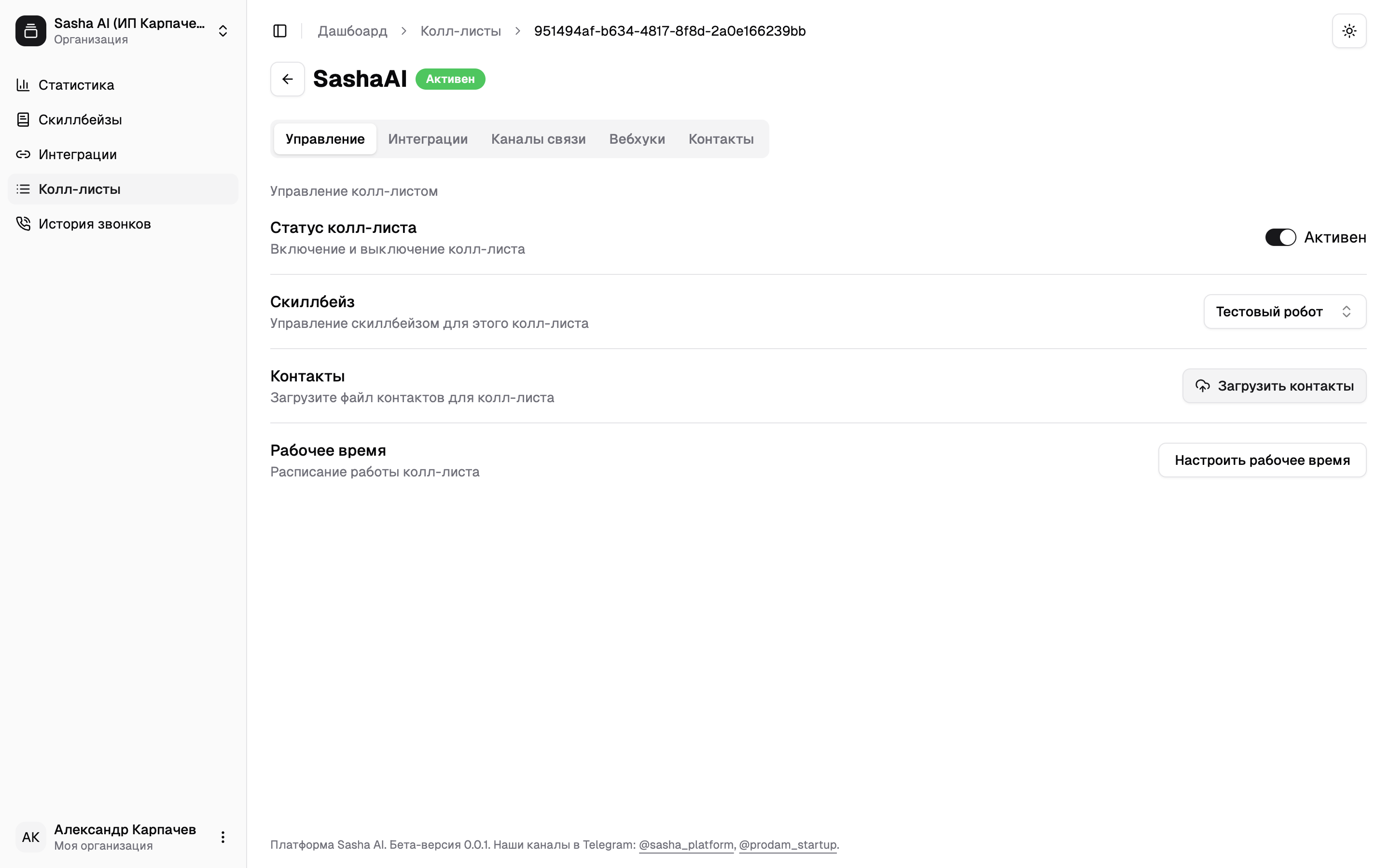 Не выходя из созданного колл-листа перейдите в раздел «Управление» и активируйте прозвон с помощью ползунка «Статус