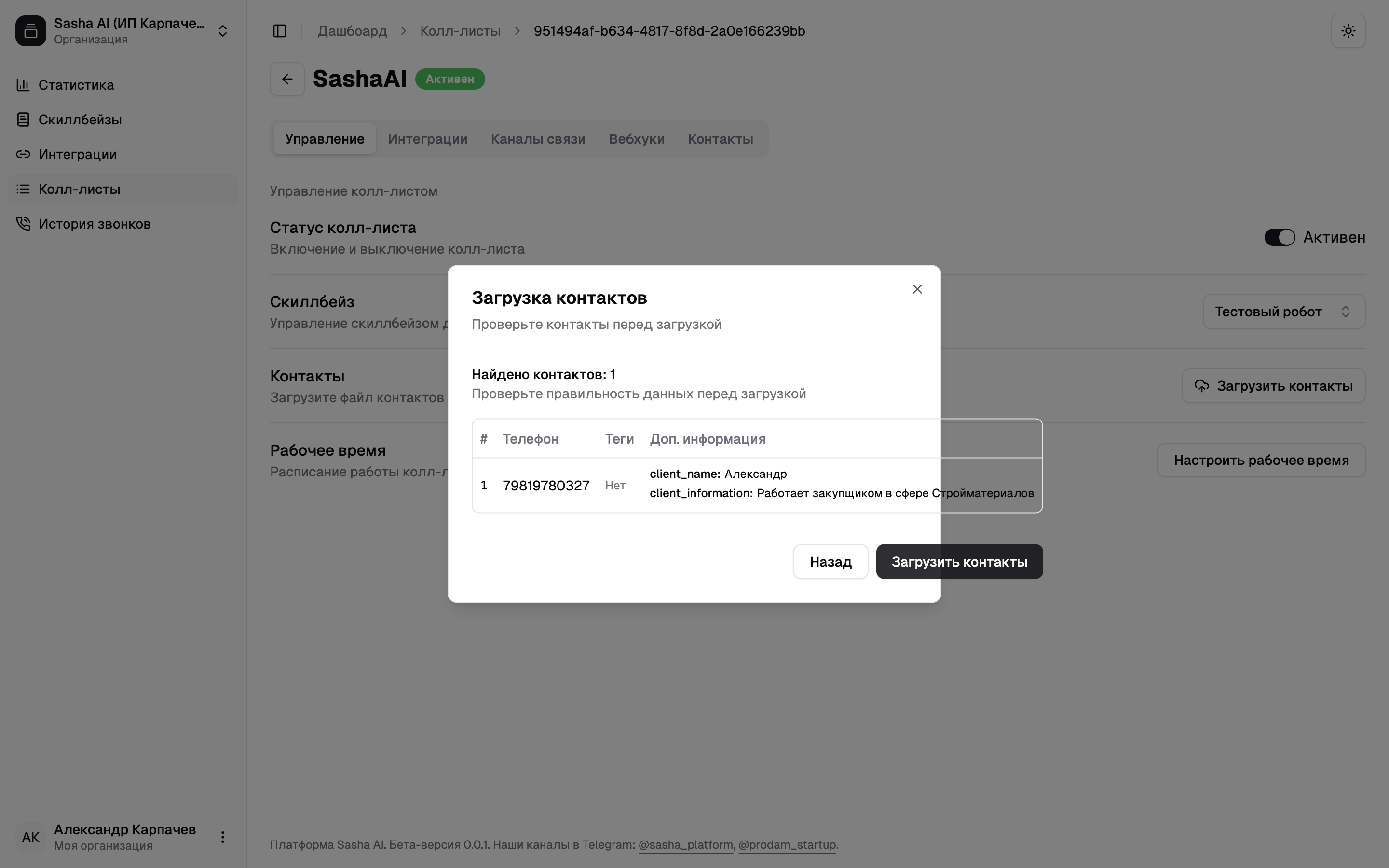 «Быстрый старт» скиллбейс и нажмите на кнопку «Загрузить контакты»